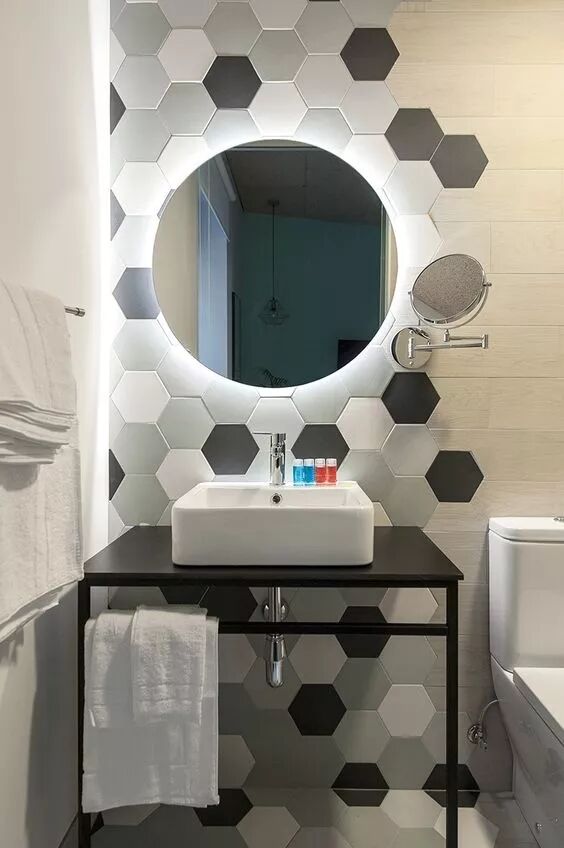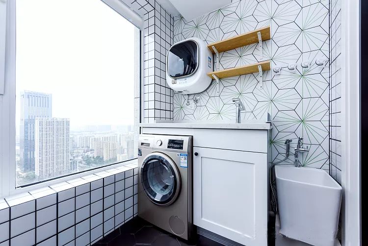 ▲台盆区六角砖与瓷砖不规则拼接,错落出别致的美感,打破素色空间的沉默,跳跃的黑白图案让每一次洗漱都轻松愉快。