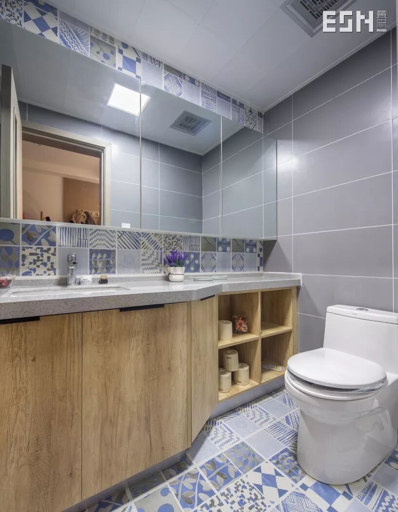 打破传统,原木色浴室柜与青色小花砖搭配,带有几分文艺气息。