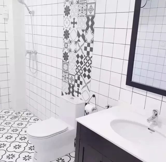 ▲马桶后局部铺贴的小花砖,与地砖搭配,黑与白的对比,精美别致的图案,卫生间也出现在了朋友圈。色彩多样让花砖与浴室天生合拍。