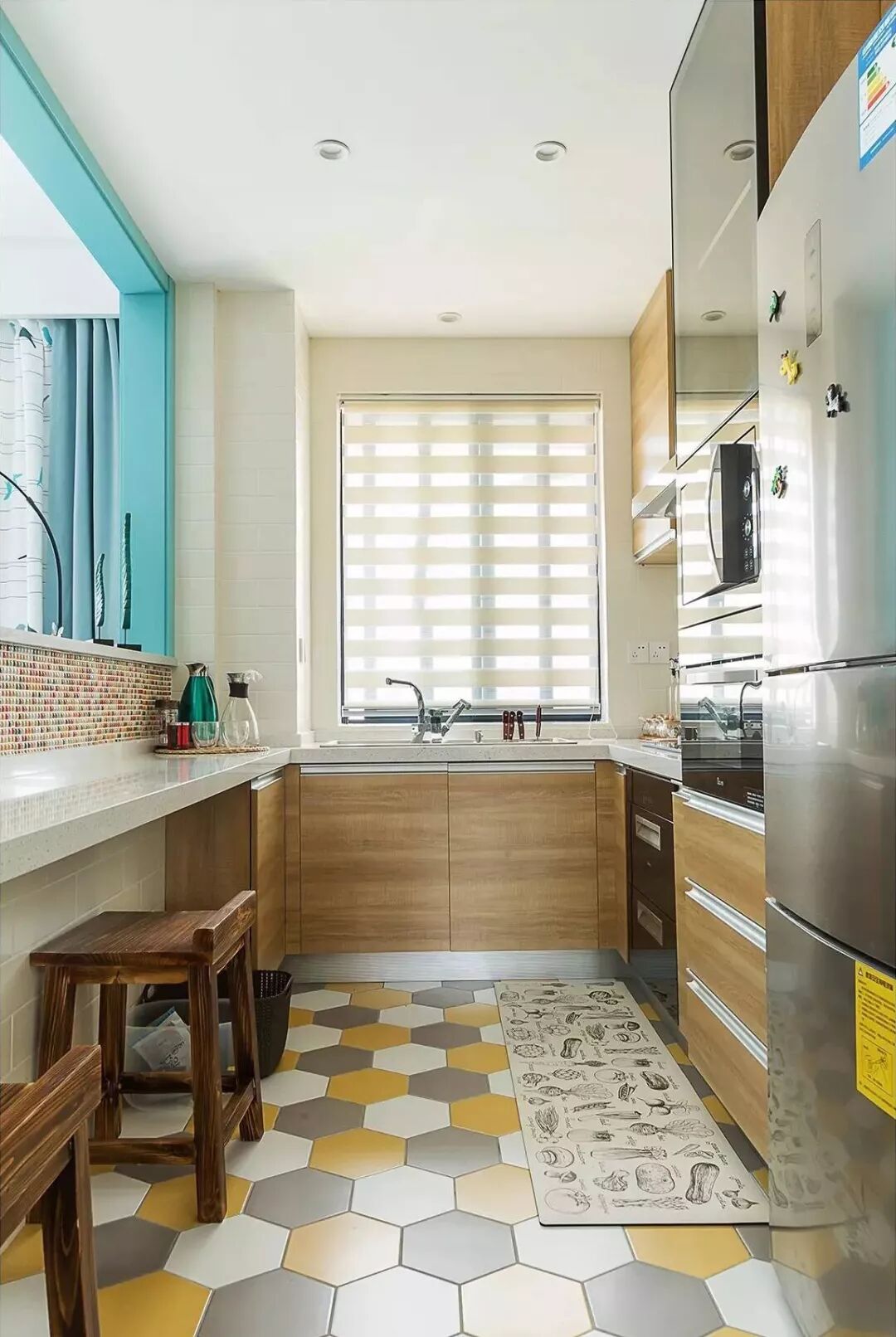 ▲厨房地砖采用灰白相间的六角砖铺贴,中间穿插小黄砖点缀,搭配木黄色防滑垫,让整个空间更有生气。在这样的厨房做饭也变成一件轻松的事情。