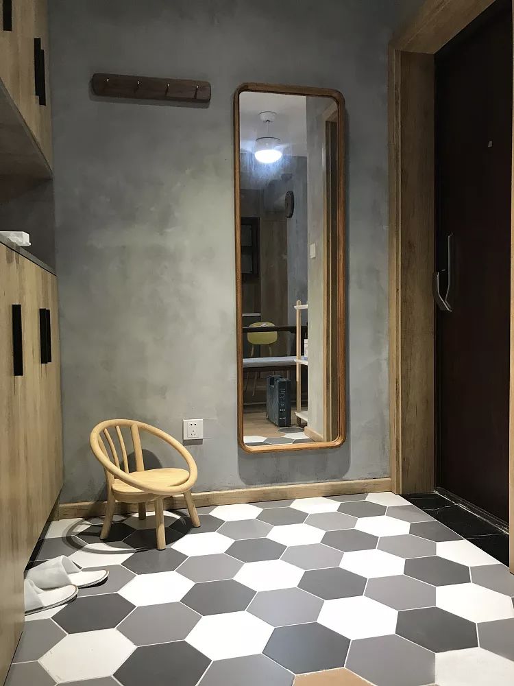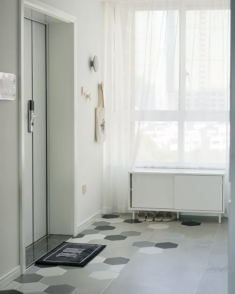 ▲黑白灰三种不同颜色的六角装与大地砖拼接,跳跃出空间的灵性,像是有淘气的小孩踮着脚尖在上面跳舞。用花砖铺贴玄关地面,能兼顾实用性与装饰性。