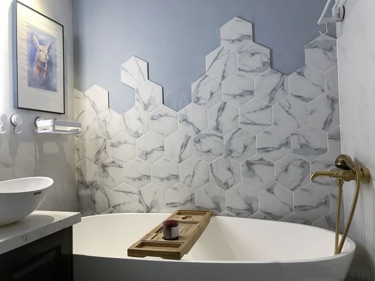 ▲大理石纹路的六角砖打破素色空间的沉默,跳跃错落的图案平添浪漫,彰显出主人的生活情趣,这是一场全身心的洗涤。