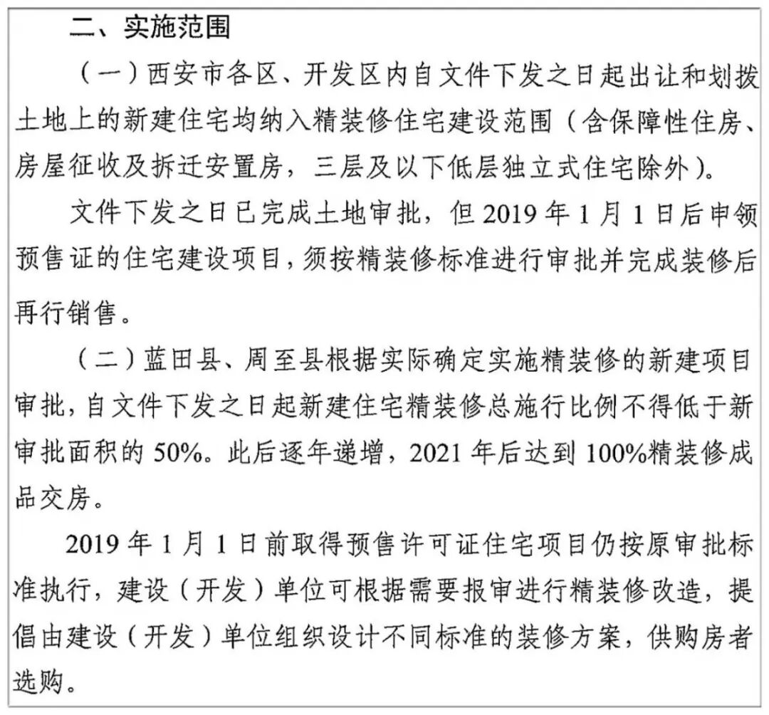 2018年12月11日中午,一份名为《西安市新建住宅精装修实施方案》的文件在网上流传,文件称:从2019年1月1日起西安市制定范围内(不含蓝田县、周至县)所有新建住均纳入精装修住宅建设范围。