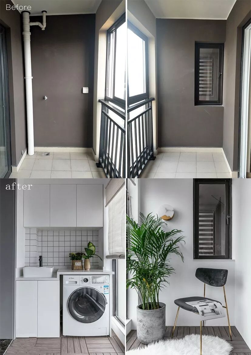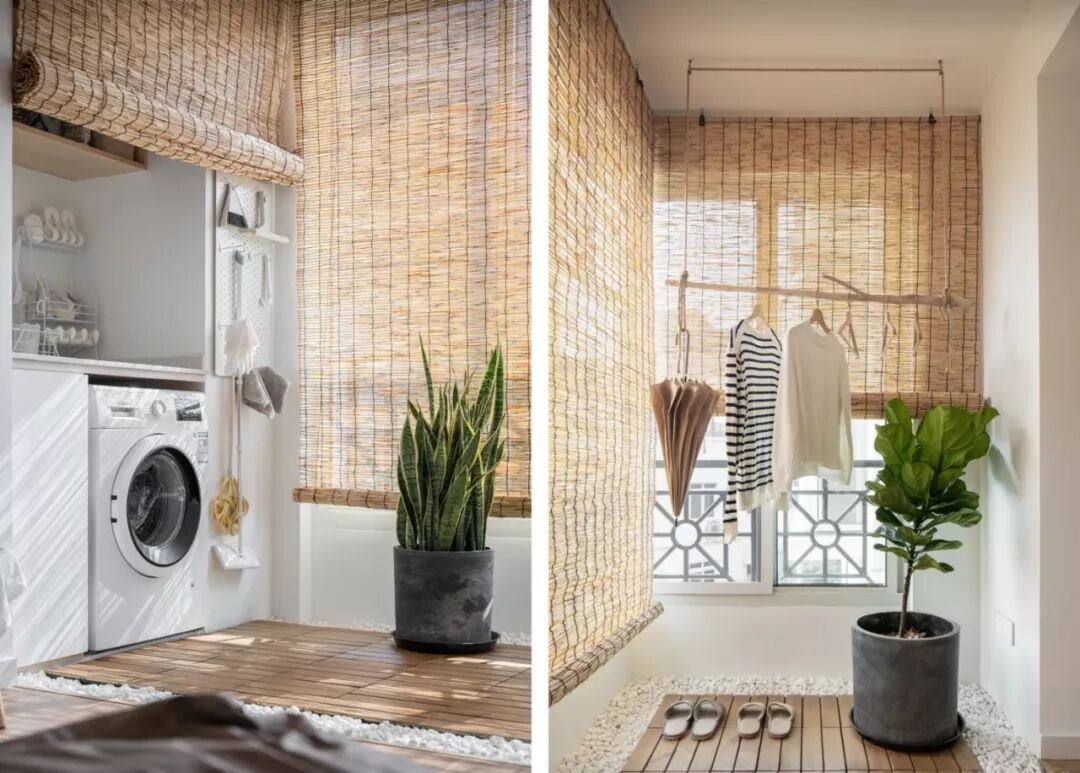 如果家里只有一个阳台,它不仅要承载洗衣晾晒的功能,还要承担诗与远方。在阳台的角落,放置一把小座椅,闲暇时光陶冶情操。