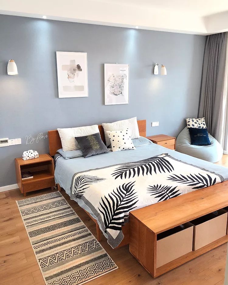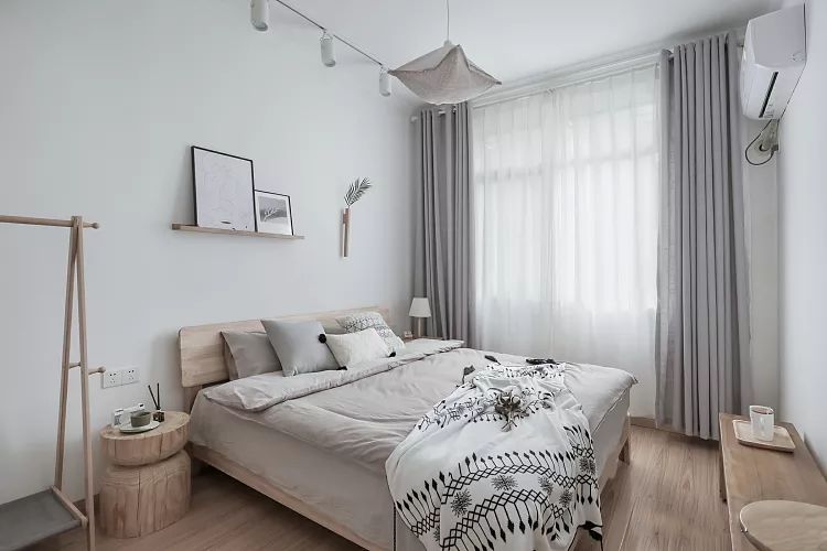 卧室的生活基本用品,一张床、一个衣柜。如果床的尺寸较大,在颜色上最好选择和家里环境想匹配的,或纯色的,切记花纹不要复杂,不用担心空间单调,后期的小装饰也能润色空间。